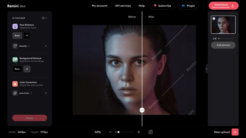 Remini是一個借助AI技術將模糊照片變高清和老照片修復的工具,該AI修圖工具在全球累計已超過數百萬人使用。Remini利用先進的AI算法,分析照片中的現有元素并智能填補缺失的圖像細節,如增強紋理、校正顏色和平滑邊緣等,以使照片中的主體和對象更加清晰,從而提升圖像的畫質和清晰度。該工具支持移動端APP和網頁版使用,適用于修復家庭舊照片、提高低分辨率相機拍攝的圖像質量、從網絡下載的模糊圖片、修復因年久失修或保存不當而損壞的照片,大家快來AI365導航!