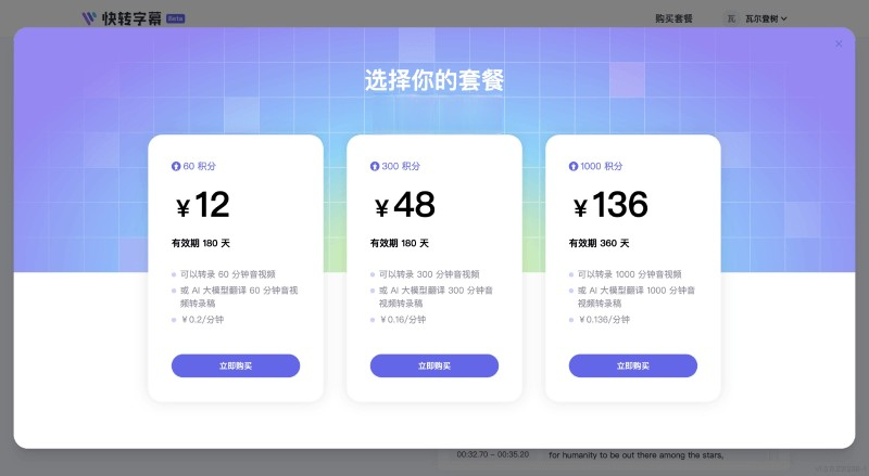 - 12元60積分,可以轉錄/翻譯60分鐘音視頻/音視頻轉錄稿,有效期180天